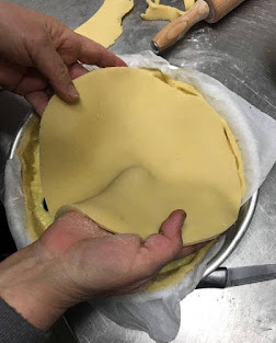 A fuoco spento aggiungiamo il cioccolato e la buccia di limone grattugiato. Mentre lasciamo raffreddare la crema, passiamo con lo stendere la pasta frolla, con uno spessore di circa 1,5 - 2 cm in una teglia da 28 cm.