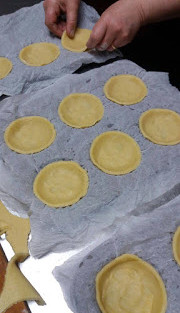 Con un coppa pasta rotondo ritagliate la frolla e disponetela nello stampo delle crostatine, facendola aderire bene. Lo stampo potete sia imburrarlo ed infarinarlo, sia utilizzare la carta da forno.